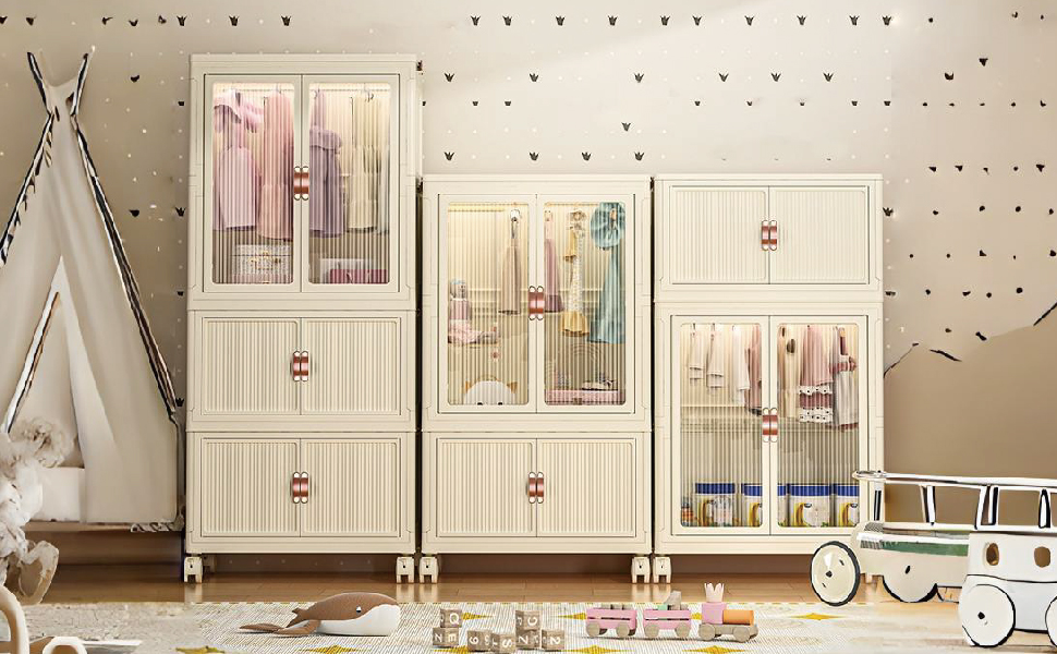 Der Kinderkleiderschrank verfügt über 360-Grad-Drehrollen mit Bremsen am Boden, sodass Sie ihn mühelos an den gewünschten Ort verschieben können.