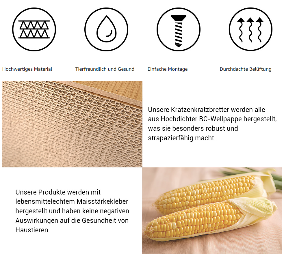 Wir bieten einen Ort des Komforts und der Unterhaltung, der sowohl praktisch als auch gemütlich ist. Unser Kratzbrett ist nicht nur ein Haushaltsgegenstand, sondern auch eine Fürsorge für Ihre Familienmitglieder. Qualitätsgarantie ermöglicht es Ihnen und Ihrer Katze, gemeinsam glückliche Stunden zu verbringen.